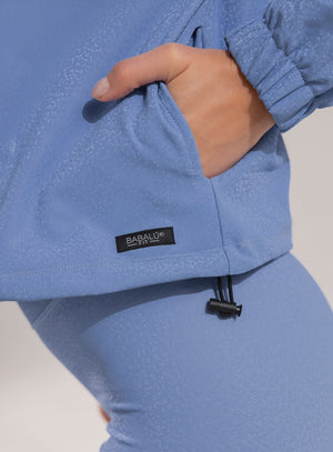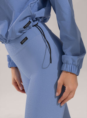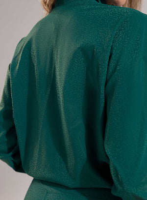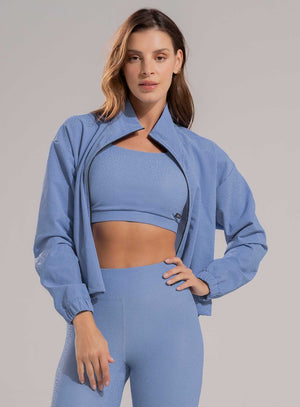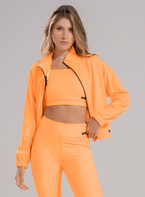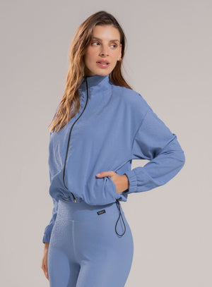 Chaqueta de cuello alto con cierre en frente, bolsillos laterales y ruedo con elástico tipo cordón con terminal para ajustar a la medida en cintura, tela de acabado brillante.