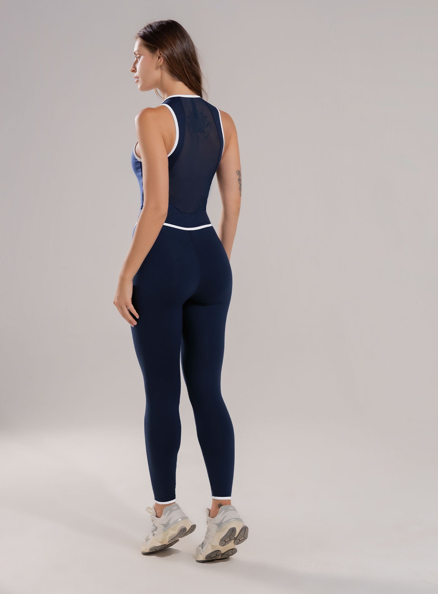 Enterizo deportivo largo de manga sisa con cierre en frente, corte en malla tull en la espalda y sesgos en contraste, refuerzo en triangulo para evitar marcaciones y mayor comodidad en los movimientos..