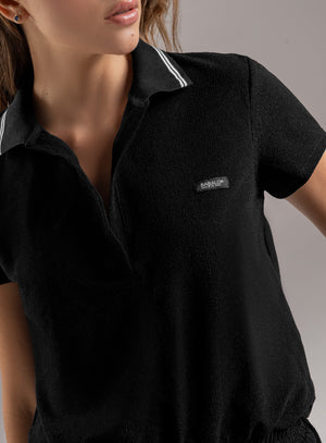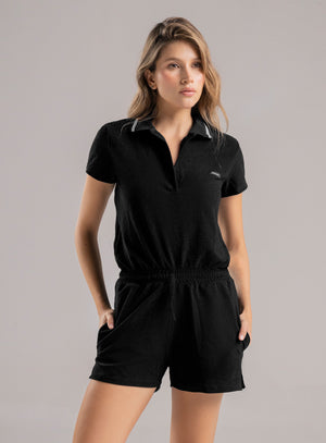 enterizo corto deportivo dama estilo urbano con cuello tejido y abertura en el pecho. tela elástica y pretina con elástico interno para mejor ajuste en cintura, cordón que permite adaptarse a la silueta. incluye bolsillos laterales funcionales en el short.