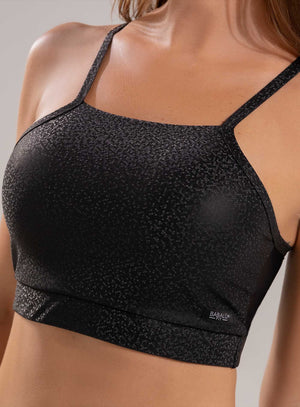 Top deportivo de cargaderas con acabado brillante y espalda en malla tull con corte cut out en el centro, tela de acabado brillante.