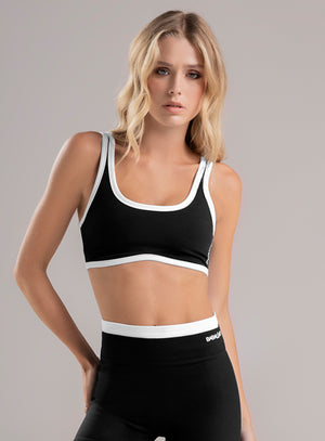 top deportivo dama con leve curva en cintura,sesgos en contraste en escote, sisas y cintura, incluye forro interno y elástico interno para mejor ajuste