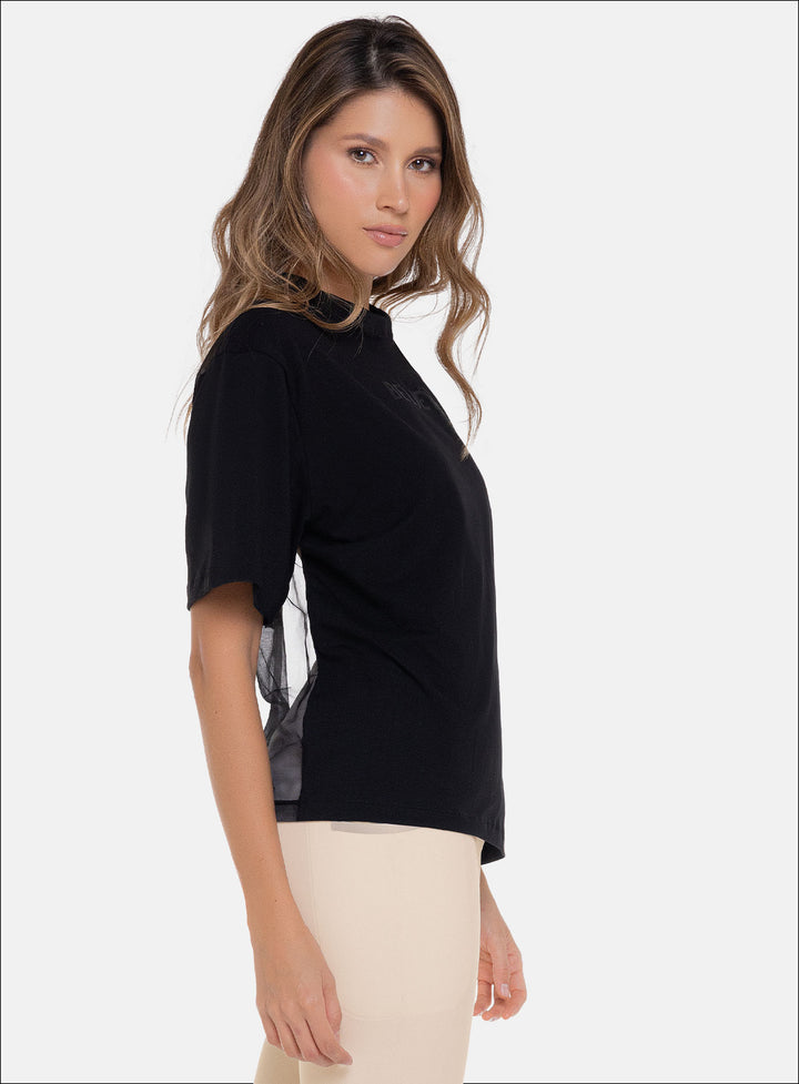 CAMISETA CON TOQUE DISTINTIVO Y POSITIVO CON DISEÑO QUE PERMITE LIBERTAD DE MOVIMIENTO, OPTIMIZANDO RENDIMIENTO SIN RESTRICCIONES, PERFECTA PARA YOGA, PILATES, CORRER O SIMPLEMENTE PARA UN ESTILO DE VIDA ACTIVO Y CONSCIENTE. CONFECCIONADA EN TELA BURDA Y MALLA TRANSPARENTE