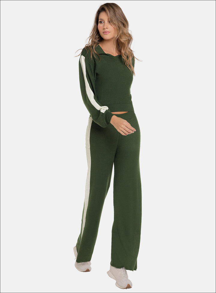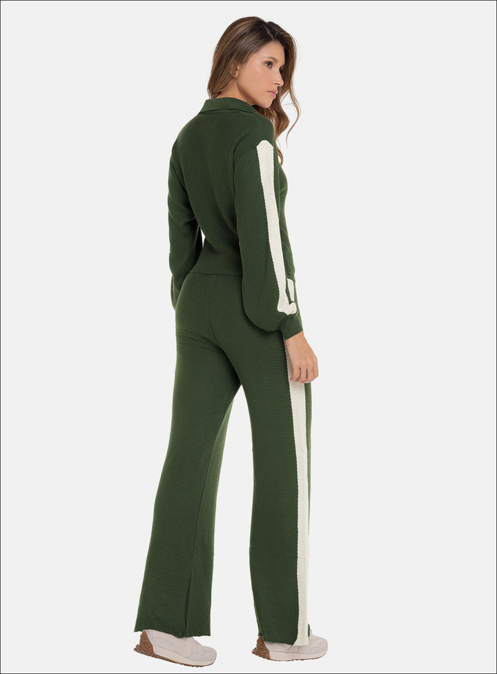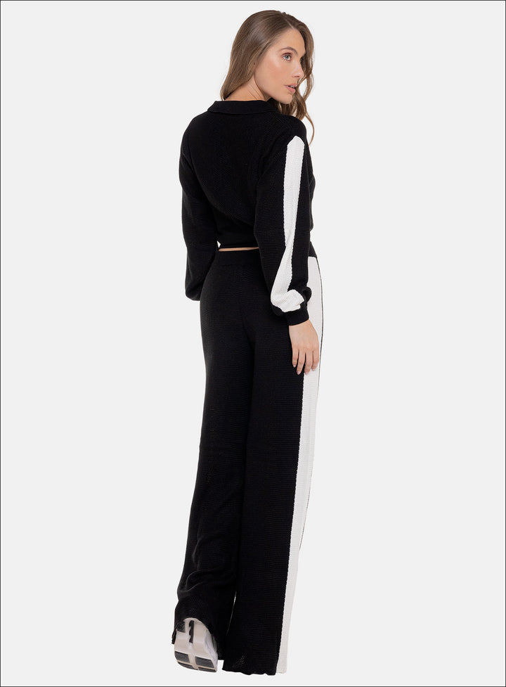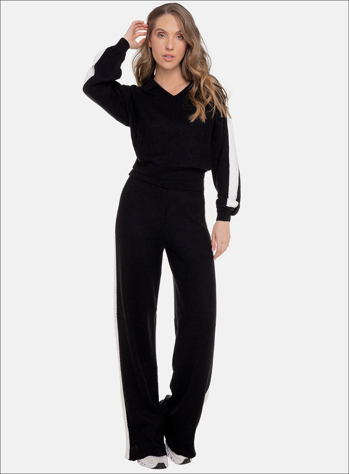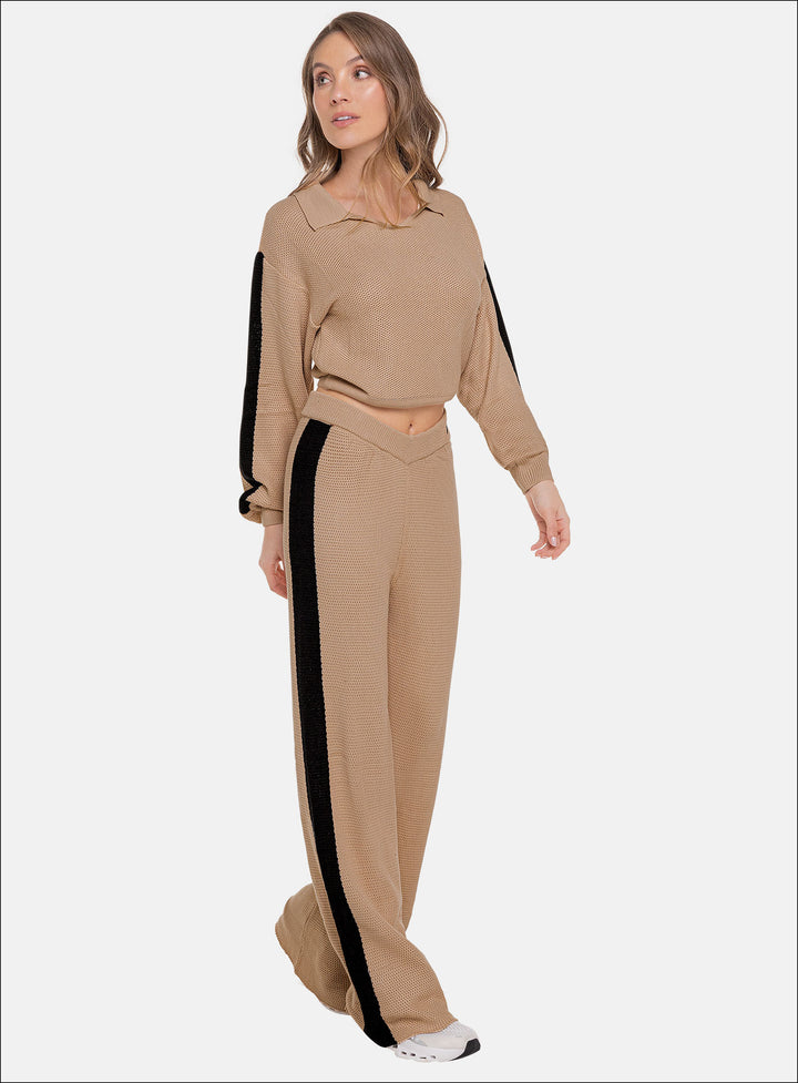 PANTALÓN BOTA ANCHA DE CAÍDA SUAVE EN TEJIDO ACANALADO CON FRANJA LATERAL EN CONTRASTE, COMODO Y MODERNO PERFECTO PARA LOOKS RELAJADOS