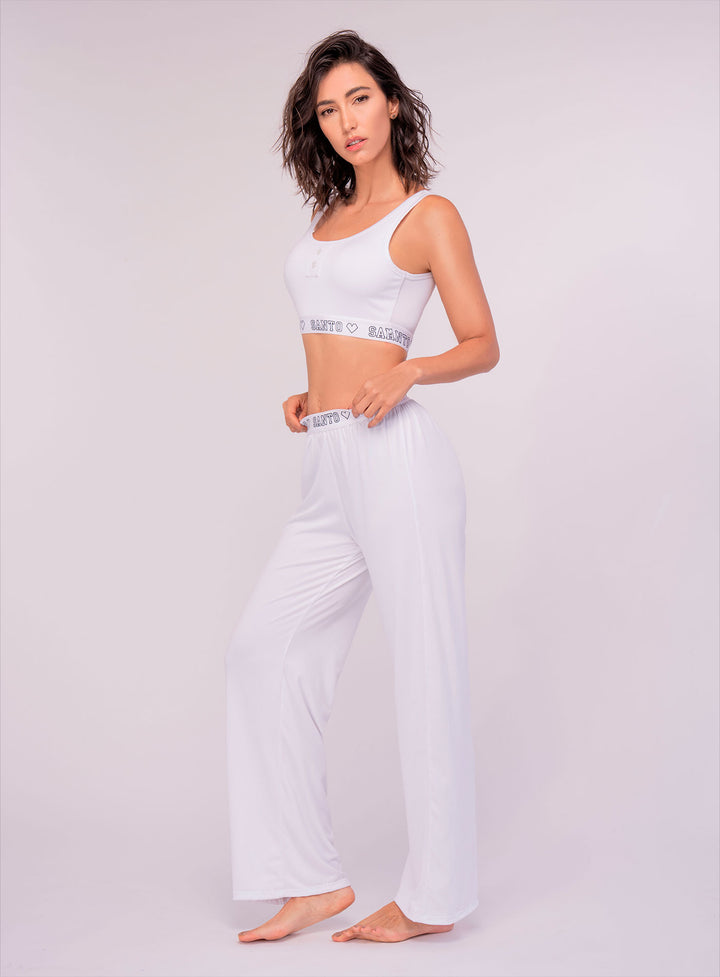 PIJAMA ESTILO DEPORTIVO. CON TOP CORTO Y PANTALÓN AMPLIO DE TIRO MEDIO. AMBAS PRENDAS INCLUYEN PRETINA ELASTICA ESTAMPADAS, OFRECIENDO UN LOOK MODERNO Y CÓMODO.