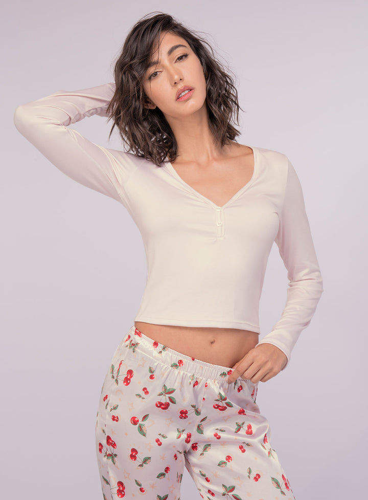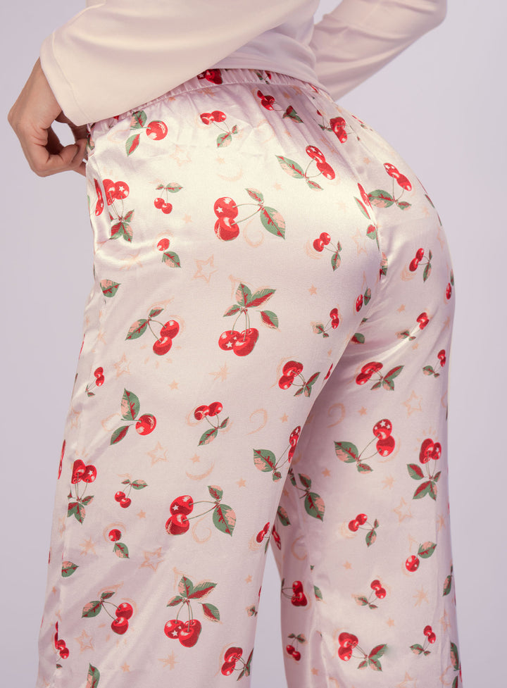 PIJAMA DE ESTILO FRESCO Y FEMENINO, CON PANTALÓN EN SATIN Y BLUSA EN ALGODÓN. UNA COMBINACIÓN SUAVE, COMODA Y LLENA DE ENCANTO.