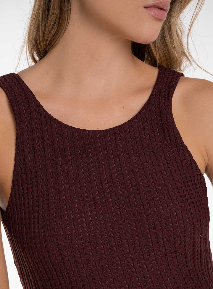 VESTIDO CON NUDO EN FRENTE QUE REALZA EL BUSTO, ABERTURA LATERAL QUE CREA UNA SILUETA PERFECTA PARA UN LOOK CASUAL, ELEGANTE O DEPORTIVO, EN TELA TEJIDA QUE SE ADAPTA A TU CUERPO COMO UNA SEGUNDA PIEL GARANTIZANDO COMODIDAD Y AJUSTE PERFECTO.